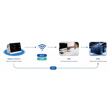 AIView se može povezati s centralnom nadzornom stanicom CMS putem žične ili bežične mreže. Omogućuje nadzor uz pacijentov krevet, povezivanje s elektroničkim medicinskim zapisom EMR putem HL7 izlaza te podržava nadzor između kreveta bez potrebe za povezivanjem na CMS.